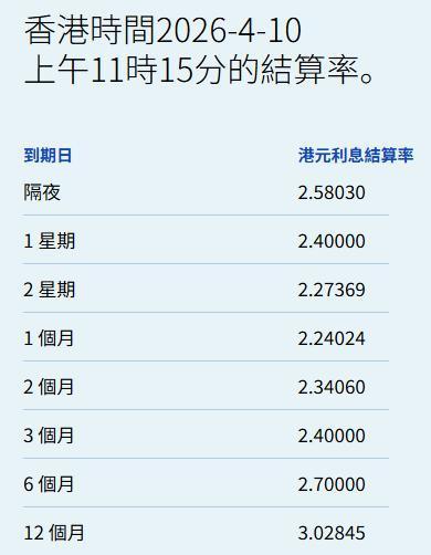 智通财经APP获悉,4月10日,港元拆息普遍向下,而与楼按相关的一个月拆息终止三连升报2.24024%,跌8.297基点;反映银行资金成本的三个月拆息报2.4%,跌2.798基点。