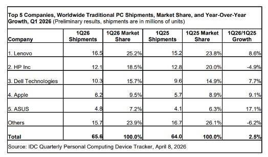几家行业巨头在市场份额的表现分化,是本季度最直观的信号。两家机构数据都显示,市场份额前五分别是联想、惠普、戴尔、苹果和华硕。其中联想以超1650万台的出货量和超25%的市场份额领跑,出货量同比增长超8%。惠普则成为前五大厂商中唯一出货量下滑的企业,出货量同比下降4.9%,市场份额从20%滑落至18.5%左右。苹果凭借新款MacBook Pro、MacBook Air以及低价机型MacBook Neo的表现,市场份额突破10%。华硕则以超10%的同比增速成为前五大厂商中增长最快的品牌。